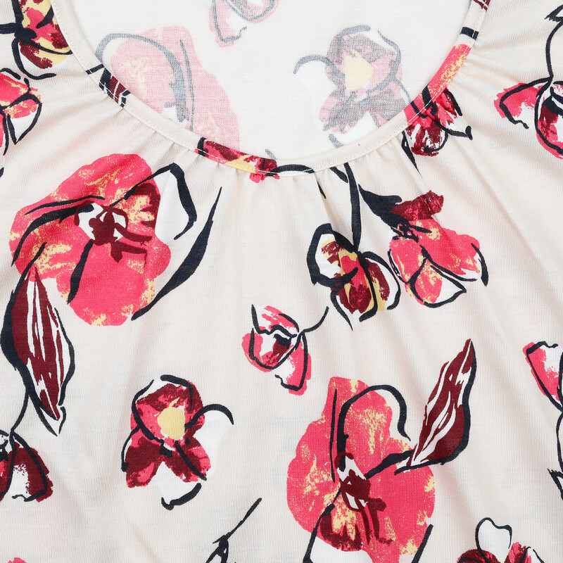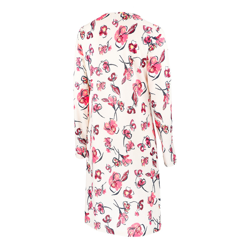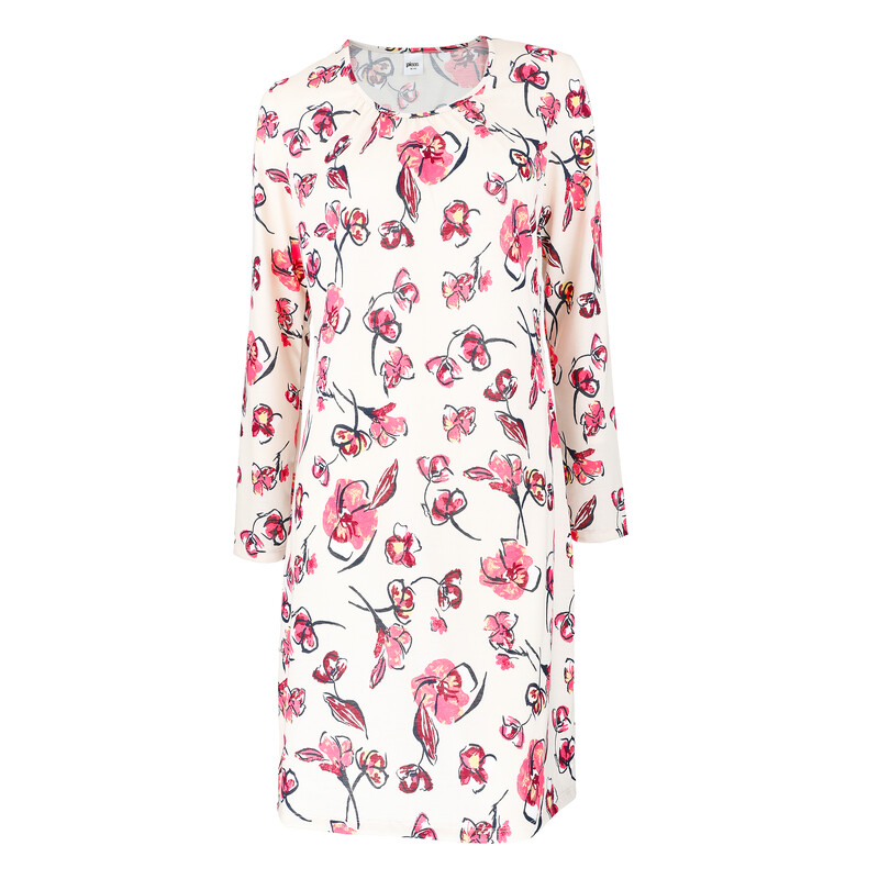 Dámská noční košile s dlouhým rukávem, kulatým výstřihem s mírným řasením.