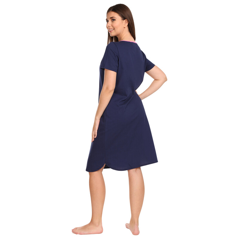 Dámská mladistvá noční košile střední délky s kontrastním kulatým výstřihem a krátkým rukávem. Košile má zakulacený dolní lem a velký potisk. Délka : od výstřihu / zadní díl pro vel.38/S = 96 cm ; u každé další velikosti cca + o 1 cm více než předchozí velikost