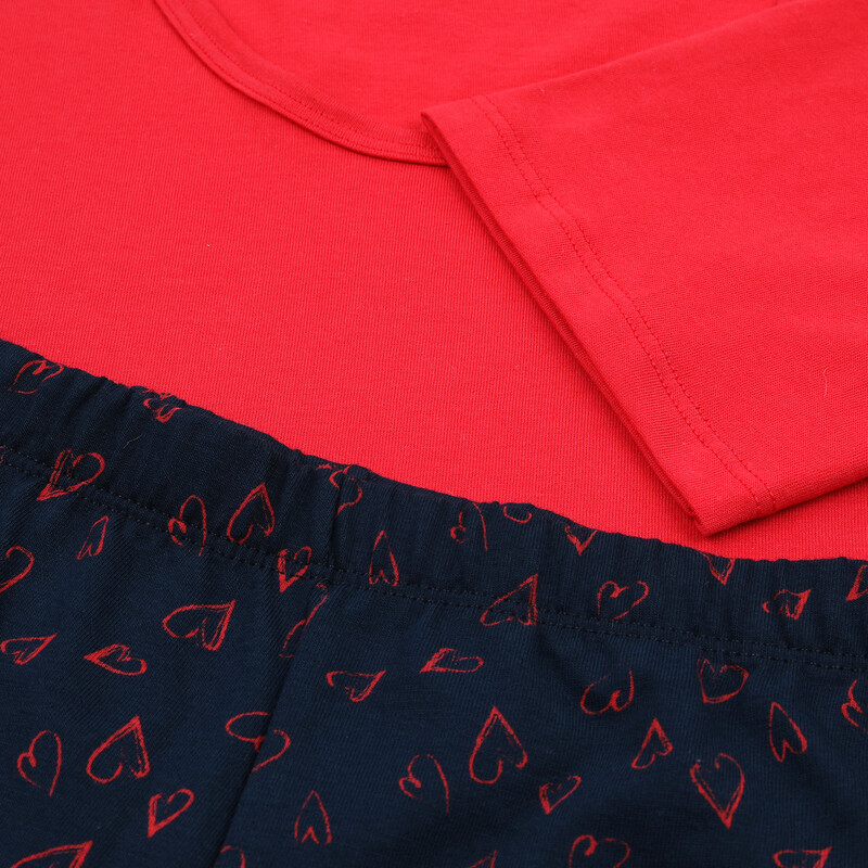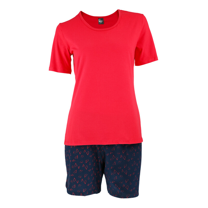 Mladistvé dámské pyžamo s krátkým rukávem a kulatým výstřihem. Šortky mají motiv srdíček v pase všitá guma